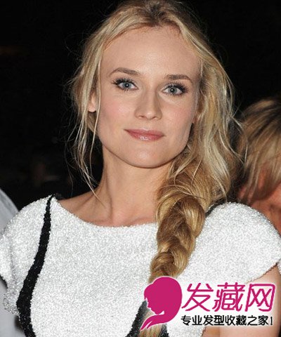 因为比普通的编辫多了上部分的大波浪弧度而更有妩媚风情。重要的是在编辫之前先将不编辫的部分的弧度固定,而后再以极松的手法将编辫的部分完成,编法避免特别规矩,偶尔将三股辫的平衡打破,造出凌乱的美感。