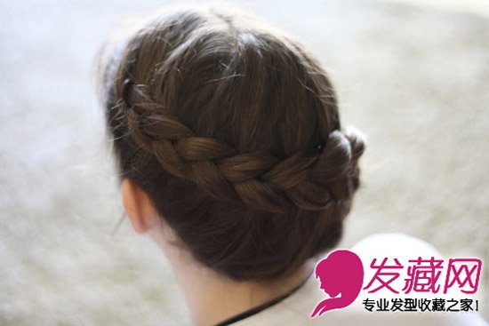 虽只是一条普通的编辫,却因为是从上到下略倾斜的角度而打破死板,别致清新。重要的是要有刘海,以平衡掉盘发的厚重。同时开始的发量要略大,将前额靠下部位的多数秀发收起,以略斜的角度编才能自然。