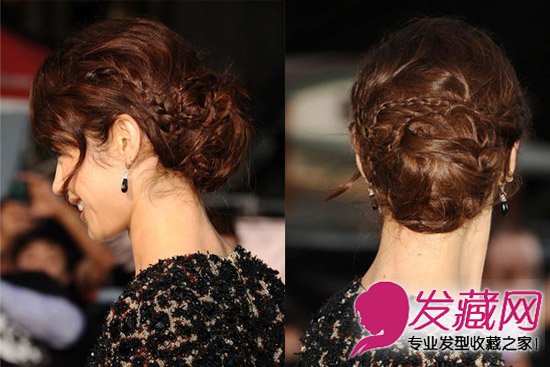 这款发型看起来很难操作,其实关键就在于要先编好几个细麻花辫,然后把它们和剩余的头发一起盘成发髻。加入麻花辫的盘发大大减少了严肃感,让造型看上去轻松了不少。