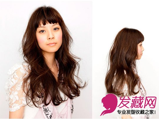 发型点评:长长的大波浪卷发妩媚浪漫,眉毛以上的碎发刘海更好的衬托出立体的五官,起到完美的修颜效果。