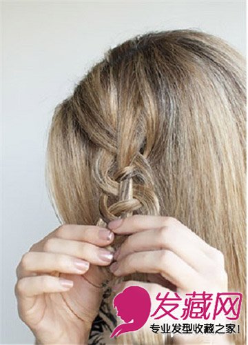STEP1. 把刘海稍上的一部分头发均匀分成三部分,傍边的两部分来回围着中间的一部分绕,编好后用透明橡皮筋绑好,再稍稍拉宽两边的头发。