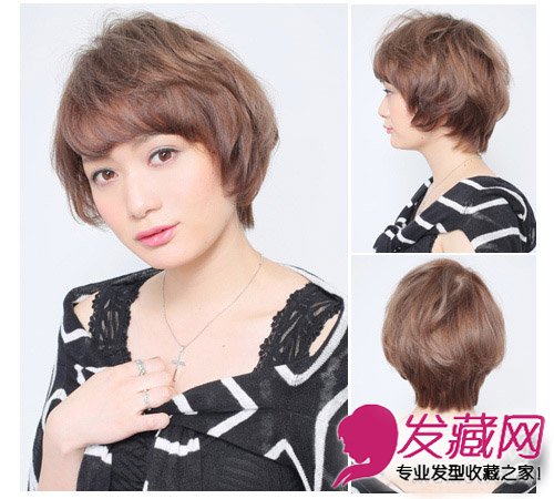 及眉的斜刘海遮盖额头缩短脸型长比例,起到瘦脸的作用,微卷短发提升发型立体感,有增添的效果。