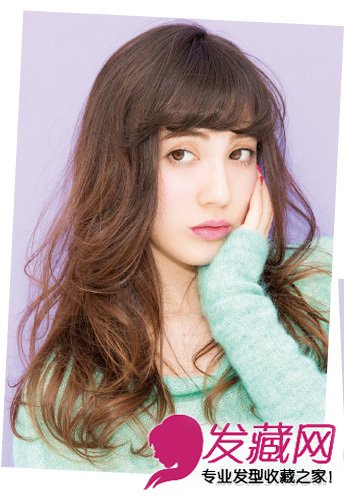 内扣烫刘海搭配蓬松长卷发修出纤细小脸,棕色头发衬出白皙肌肤。