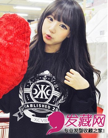 纯黑色的长卷发,凸显出十足的清新范,搭配空气感的齐刘海设计,不仅修饰出精致的五官,而且展现出甜美可爱的一面。