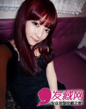 酒红色的染发,时尚靓丽,凸显出一种妩媚撩人的气息,稀疏的齐刘海设计,不仅修饰脸型,而且提升了整体造型的气质感。