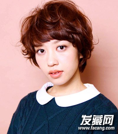 这款超短发的卷发发型十分适合鹅蛋脸的女生,方便面式的卷刘海造型,巧克力色的染发色,俏丽无比。