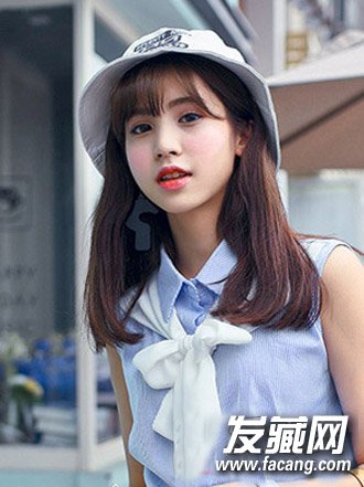 一头巧克力色系的中长发发型,微卷的内扣发尾,搭配空气感十足的齐刘海,白皙红润的脸蛋,搭配可爱的蓝色系的上衣,突显十足清新灵动范。