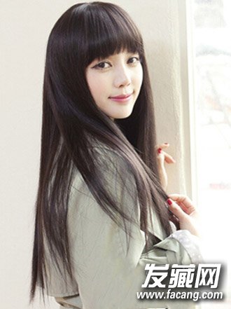 一头柔顺又飘逸的长直发发型,自然的披散下来,栗色系的发色,好看又不招摇,厚重的齐刘海,清甜的笑脸,清纯萌妹最迷人。