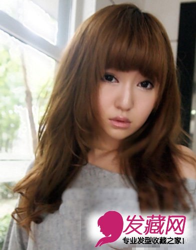 散肩的自然长发,浅棕色颜色,齐刘海+发丝,修饰脸颊制造小脸,无辜委屈的表情,萌到极点。