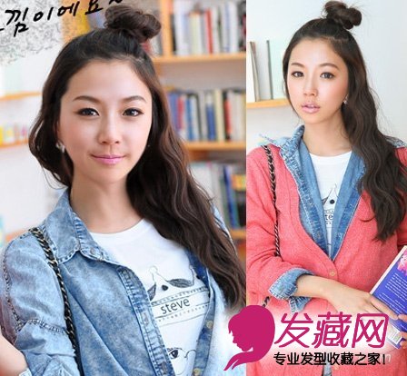 不想太幼稚、希望保留原有的波浪长卷发型,可以在披散的长发基础上,利用丸子发型来作出一点新改变——将顶发在一侧头顶歪扎成可爱的小丸子,为淑女长发增加一点趣味感,大人气的卷发立刻成功减龄!
