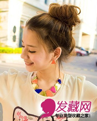 一款清爽亮丽的丸子头发型也是一款非常简单韩式发型扎法,至需随性将头发在头顶盘起,打造出丸子的造型,既显青春亮丽,又非常适合这个炎热夏季的调调,无刘海发型扎法,给人清爽舒适的感觉。