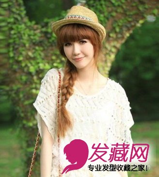 侧扎的麻花辫发型是一款兼具优雅与复古气息的发型,侧扎的松散麻花辫让你更具有女人味气息,厚重感的齐刘海发型令发型不显得太过老气,搭配一顶编织帽,又很有甜美风味。