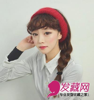 齐刘海的MM们可以自己用卷发工具将刘海烫的卷卷的,增添甜美俏皮的气息,将长发松散的编成麻花辫放置在一侧肩头,更是清新可爱,加上大红色的发带更加吸人眼球哦。