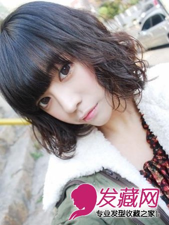 齐刘海的蛋卷头,没有一般的蛋卷头卷度那么的夸张,有点类似于麦穗烫的感觉,很有韩国女生的味道。