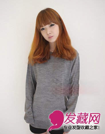 这款简约感的中长发造型,厚重的平刘海很好的修饰脸型,而土黄棕色的染发十分衬肤色,穿搭T恤,青春可爱