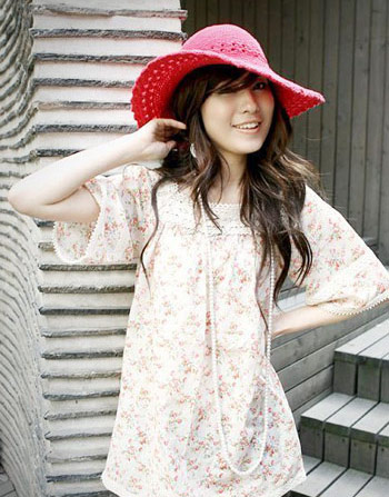 日韩美美最爱的大沿草帽发型,有线条感的长卷发 ,头帘一定要柔和的放在一边,整体要柔软不能太生硬,搭配小碎花裙,好美的哦!