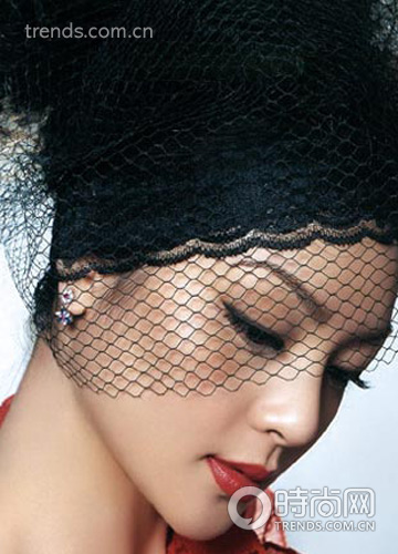 宽版蕾丝发带+网状蕾丝面纱,这样重叠的搭配法,让你的发型看起来既神秘又有些小性感。选艳丽红唇来点缀,尽显万种风情。
