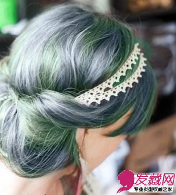 这款盘发发型非常典雅别致,银色与绿色的撞色挑染非常独特吸人眼球,搭配白色的发带更增亮点。