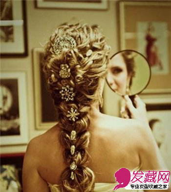 非常复古的一款发型,长卷发编制的麻花辫从发顶开始,每一个交叉处插一枚复古风格的精美珠花,非常的高贵典雅。