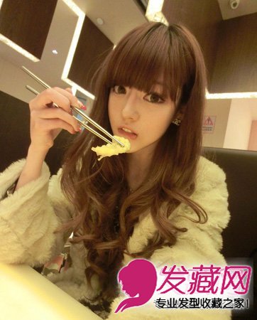 齐刘海的长卷发不但可以凸出女生的气质,而且还非常的百搭。这款齐刘海的卷发很有名媛范,不但衬托出了完美的瓜子脸,还有凸显出水汪汪的大眼睛,非常的好看。
