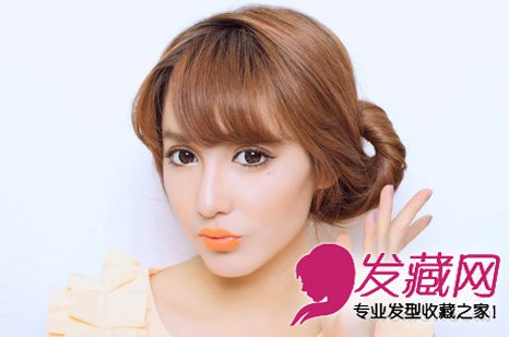 橘色的唇妆与秀发的浅色相映衬,侧面盘起一个清新可人的韩式发髻,温婉动人。