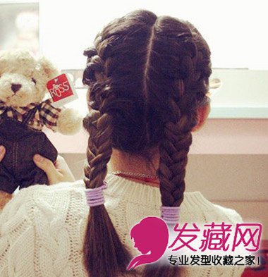 很适合萌萝莉的一款编发造型,中分长发在脑后编两根这样的粗辫子,清爽大方又很森女风。