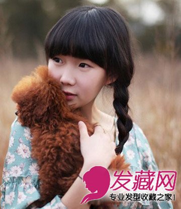 这款齐刘海发型很适合大脸妹纸拿来修颜瘦脸,乌黑发丝自然清新,扎双麻花辫的造型也很有清新的田园气息。