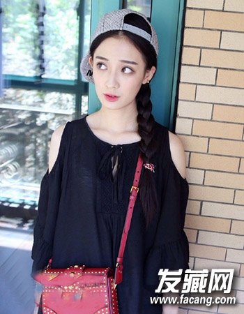俏皮可爱的一款女生发型,长发扎出一条粗壮的侧边麻花辫,十分的可爱吸睛,反戴的鸭舌帽彰显了女生的俏皮范。