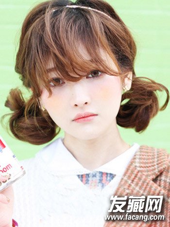 可爱的短卷发如何扎头发好看呢,蓬松的刘海与双花苞头的扎发,搭配上发饰后显露出无比的时尚感来,显露出可爱的一面来。