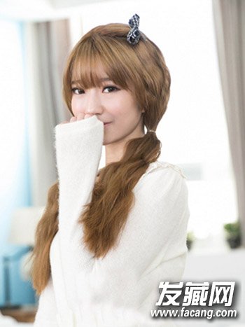 时尚的韩式麦穗烫发发型,甜美的薄刘海发型与中长发烫发搭配起来,而且甜美的双马尾搭配上小小的发饰不仅时尚而且颇为甜美。