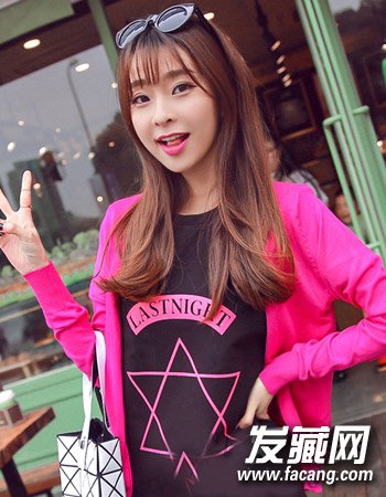 同样利用的是清新灵动的空气感刘海造型设计,而搭配浅棕色的染发颜色与清新飘逸的长直发造型,更多是凸显女生十足的粉嫩可爱感。
