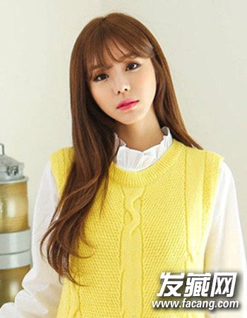 简单的利用的是清新的空气感刘海造型来增添女生的灵动少女风,再搭配时尚的深棕色染发颜色与清新飘逸的长发更添十足温柔淑女范儿。