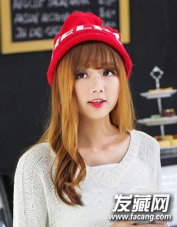 简单的利用的是明亮的橘黄色染发颜色来衬托出女生肤色的白皙感,同时也能凸显女生的青春活力风,再搭配空气感的刘海造型设计与长卷发的造型同样萌态十足。
