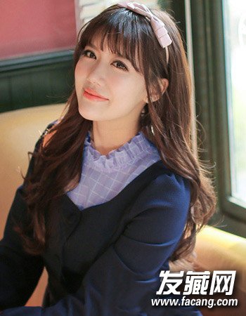 同样是甜美可爱的空气感刘海造型设计,再搭配时尚的深棕色的染发颜色与及腰形式的浪漫长卷发造型,而简单的蝴蝶结发箍设计更添十足的温柔淑女风。