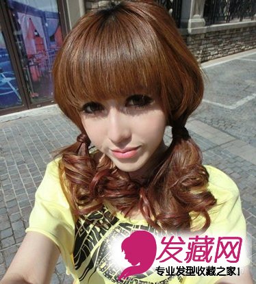 双扎的低低马尾发型是韩式发型扎法之一,既简单易学,又显得十分的俏皮可爱。卷发的扎发发型,弧度很是优美,厚重感的齐刘海,将美眉的脸打造的很是尖细。