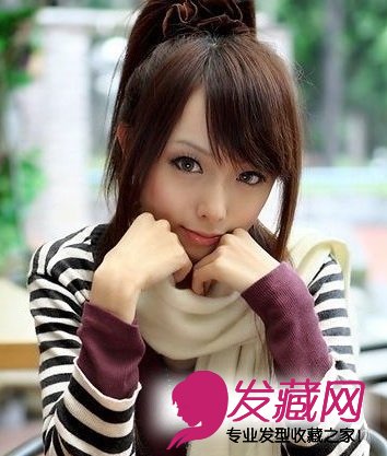 这款发型给人可爱俏皮的感觉,刘海呈二八分,两侧耳际留出的发丝很好的修饰了脸的轮廓,咖啡色的染发凸显了皮肤的白皙,高高扎起的马尾挽上可爱的花圈,整个造型卡哇伊让人忍不住想咬一口。
