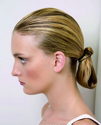 Step1 梳一个低马尾,充分喷洒有轻微定型功能的发乳或发蜡,把头发表面梳光滑。