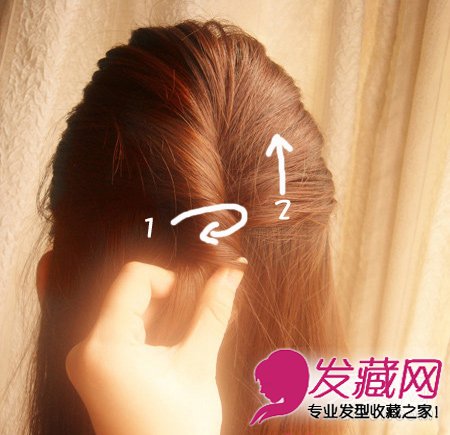 然后,在把这束头发往上推,打造出头顶蓬松的效果