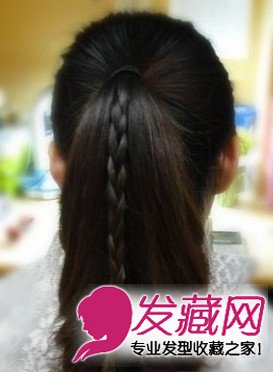 步骤二:在扎好的马尾中间去除一小束的头发,如图所示把它扎成可爱的麻花辫。