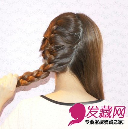 第二步:先从头顶分开左右两部分头发,左边的可以略微多一点。接着开始编一个从右斜向左侧的蜈蚣辫。