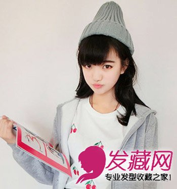 自然的微卷中发造型比较适合个性乖巧的小女生,黑发齐刘海外加一定毛线帽,尽显可爱萌感。