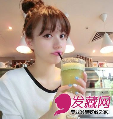 清爽干净的韩系甜美丸子头发型,高扎发髻带来爽朗清甜的即视感,空气感刘海修颜美腻。
