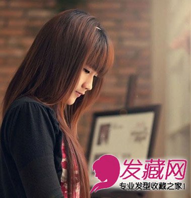 9月初秋必备的校园淑女系发型,齐刘海披肩长发,很适合性格内敛文静的女孩子,挑染的红棕色发丝显白嫩。