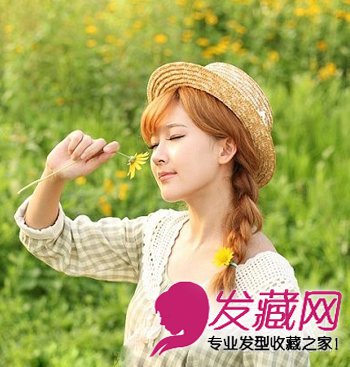 浅棕色染发的中长发在编出的麻花辫马尾,更显清新爽快。歪扎的马尾是不错的选择,简洁利落,棕色礼帽,打造很休闲的田园造型。