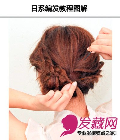 step8:再将额前的辫子也拉扯过来,重叠在一起后用多个发夹一起固定。