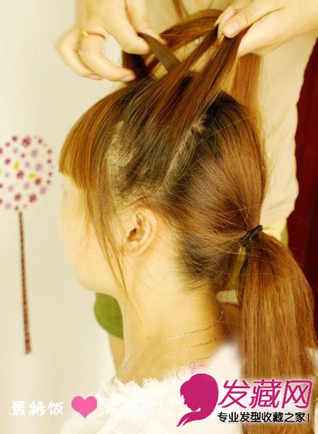第一步:将头发进行上下分区,上边区域的头发分的少一些。将下边区域的头发扎成一个马尾。从左侧耳边开始对上边区域的头发进行编发。