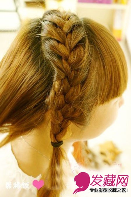 第二步:编发按照蝎子辫的编发,一直延伸到右耳耳侧,将剩下的头发编成麻花辫,用皮筋扎好垂散在耳旁。