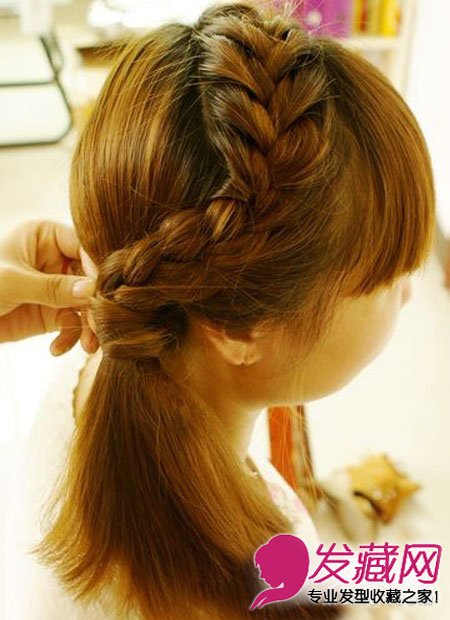 第四步:用编好的辫子缠绕马尾,形成一个低低的侧马尾,用发夹将辫子的尾稍固定一下。