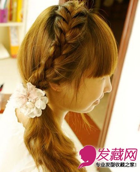 第五步:在用小发夹固定发梢的位置戴上一个白色的花朵发饰,既美观又起到了固定的作用。