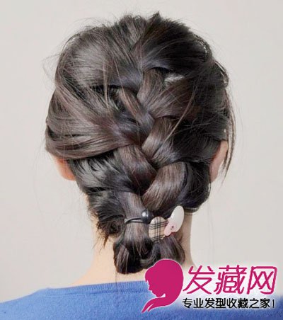 第九步:利用小黑夹将卷好的头发固定好,再在翻折的辫子上戴上一个发饰,这款发型就完成了。